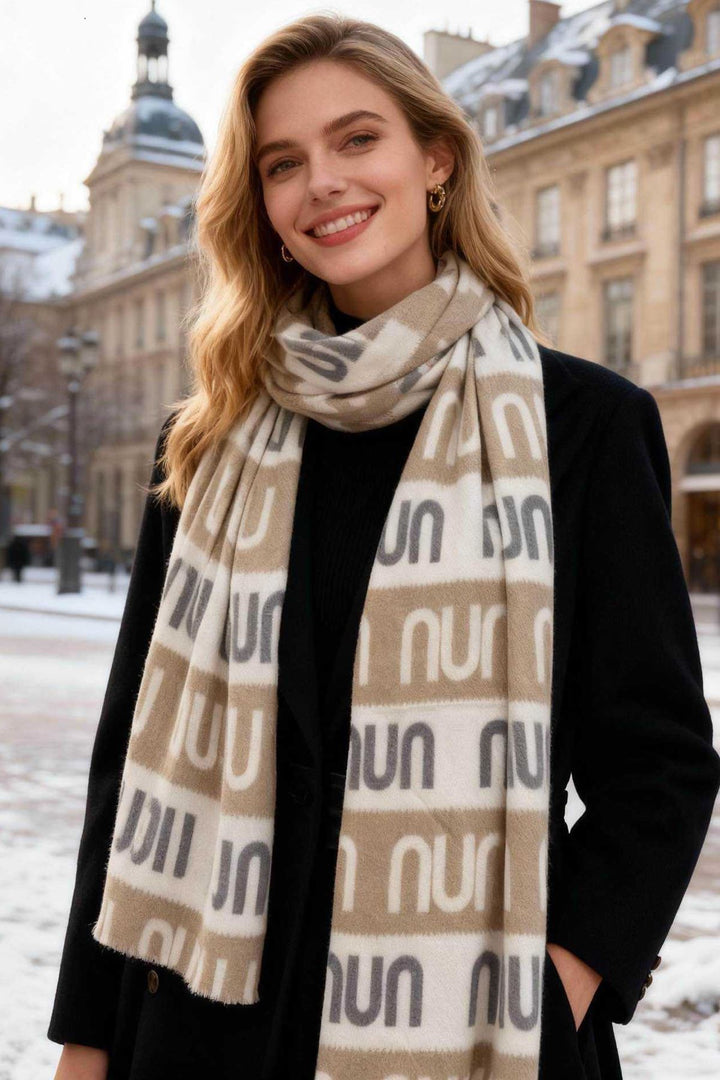 Stay cozy and stylish this winter with our ultra-soft knit oversized scarf. Designed with a bold black, cream, and taupe block pattern, this accessory features a unique lettered print that adds a modern twist to your cold-weather wardrobe. The thick, plush texture provides warmth and comfort, while its generous length allows for versatile styling—whether wrapped snugly around your neck or draped over the shoulders. Perfect for both city strolls and weekend getaways, this scarf is your go-to accessory for chic winter layering.
