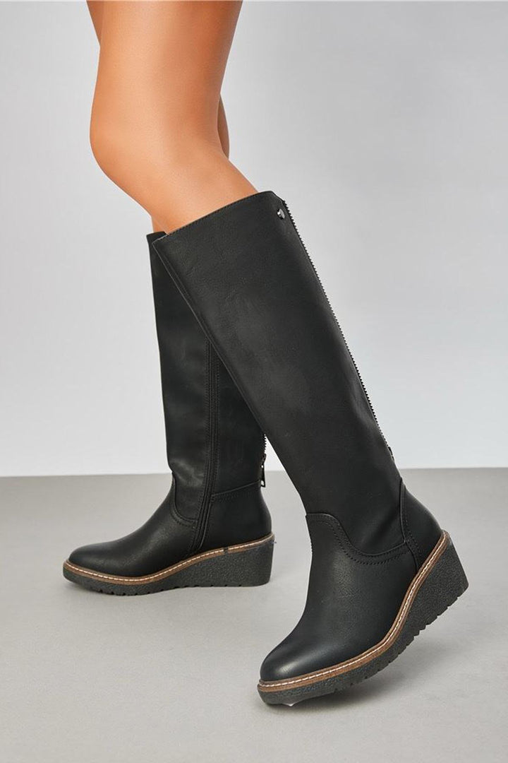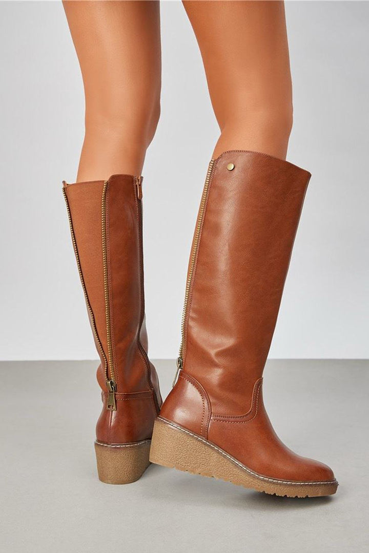 Step into effortless everyday style with these brown wedge knee-high boots. Crafted from smooth faux leather, these boots feature a classic streamlined design perfect for casual and cold-weather outfits. The soft wedge sole adds subtle height while ensuring long-lasting comfort and support throughout the day. A full inner side zip makes for easy on-and-off wear, and the contrast stitching and textured outsole offer added durability. Ideal for pairing with leggings, jeans, or skirts, these boots are a go-to choice for cozy style and all-day wearability.