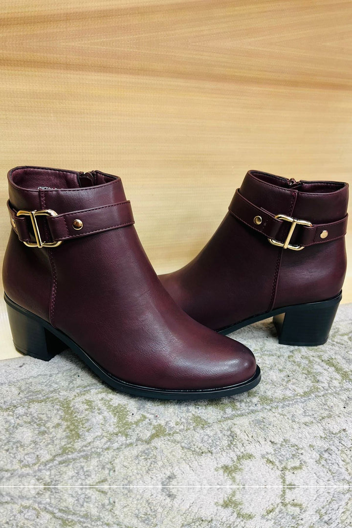Step out in style this season with these Women’s Burgundy Ankle Boots, crafted from premium faux leather for a sleek and timeless look. Featuring a chic ankle-height design, gold buckle strap detailing, and an easy side zip fastening, these boots perfectly blend fashion and function. The sturdy block heel offers comfortable elevation, making them ideal for all-day wear. Whether paired with jeans, skirts, or dresses, these boots add a sophisticated edge to any outfit — perfect for autumn and winter styling.