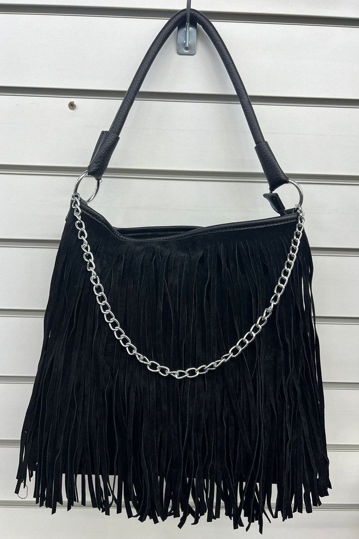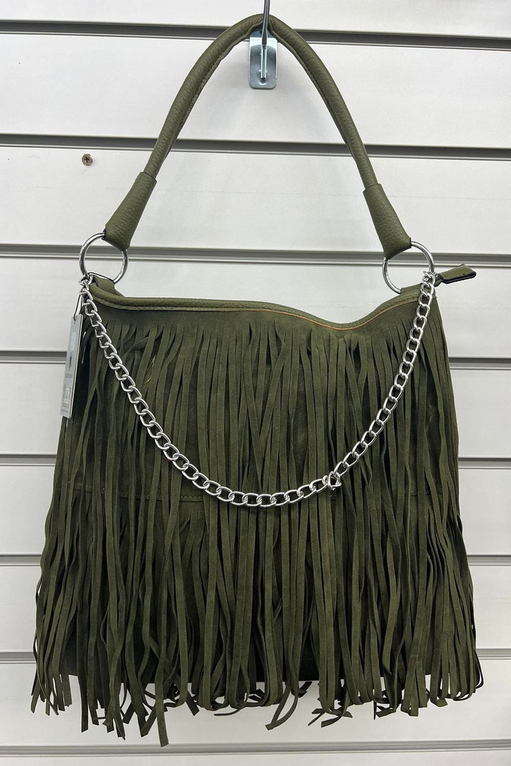 Chain Detail Faux Suede Fringe Shoulder Bag