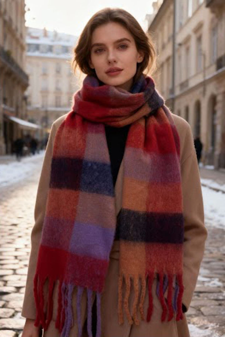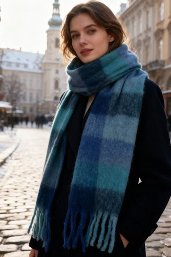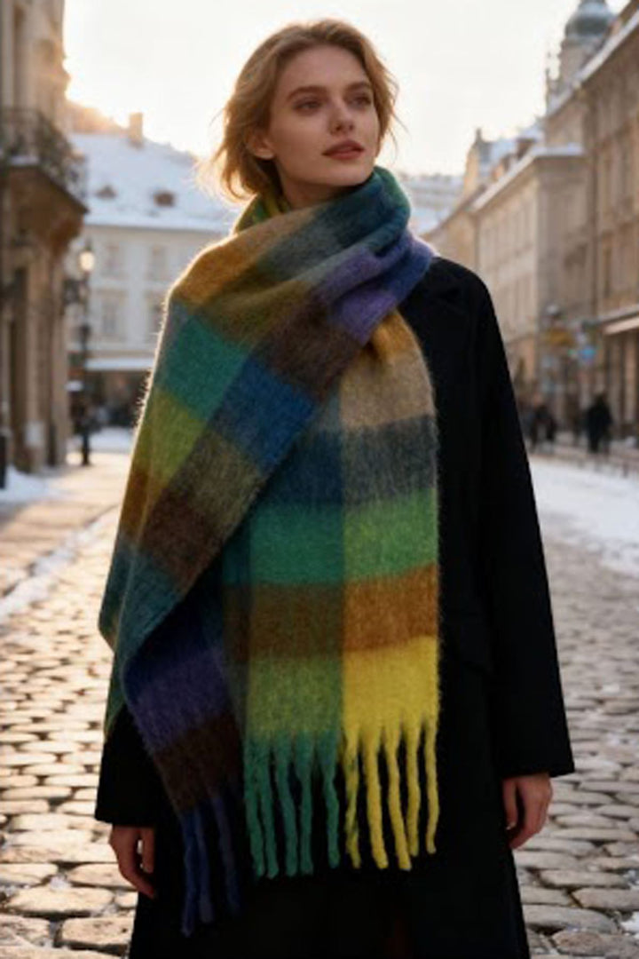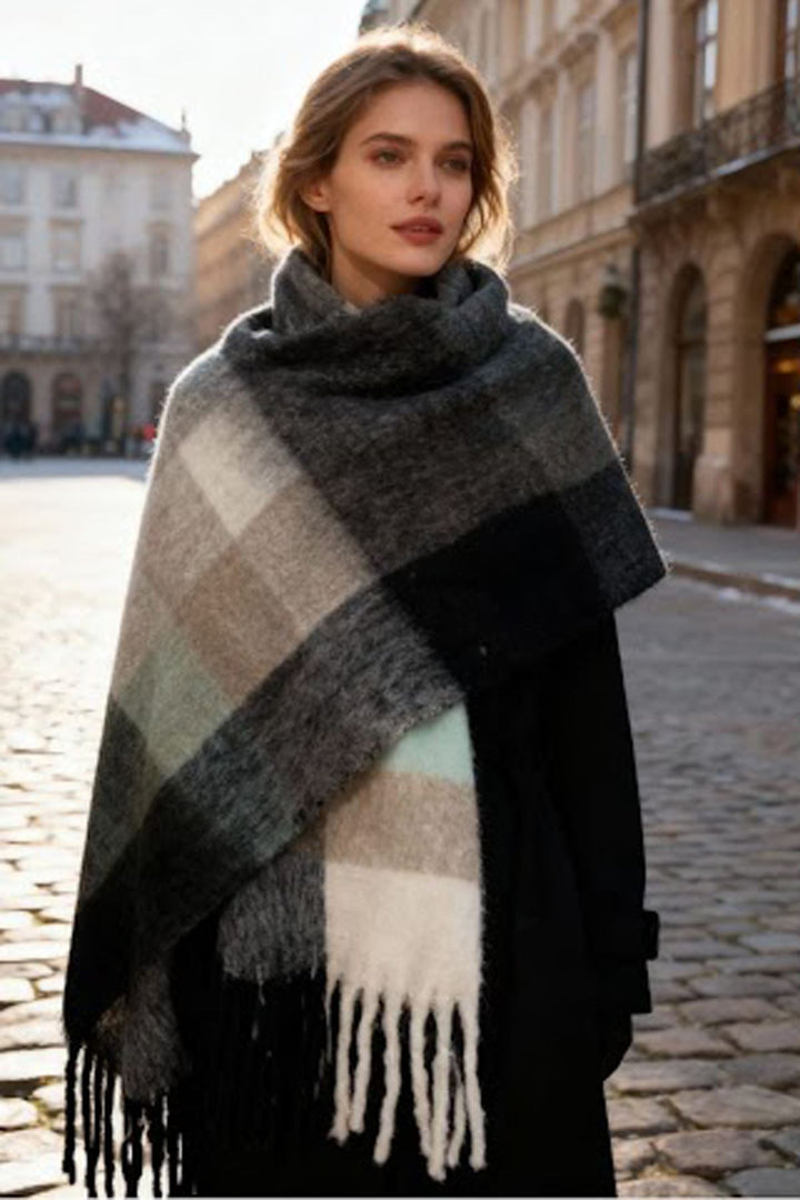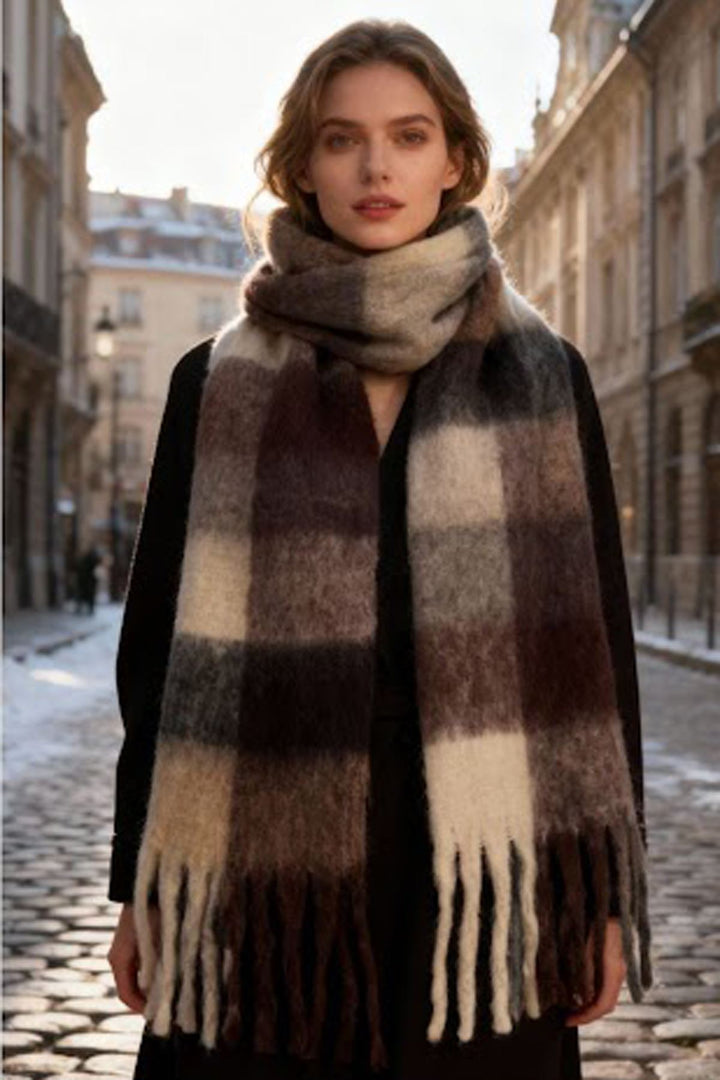 Wrap yourself in timeless sophistication with this oversized checkered tassel scarf, designed for chilly winter strolls through picturesque city streets. Crafted from a luxuriously soft and fuzzy fabric, this scarf blends cozy comfort with effortless elegance. The rich, earthy tones of cream, brown, charcoal, and coffee make it easy to pair with both casual and formal outfits, offering versatile styling throughout the cold season. Its generous size provides ample warmth, allowing it to double as a shawl or wrap when desired. The tasseled ends add a touch of classic charm, swaying gently as you move. Whether you're headed to work, out shopping, or simply enjoying a snowy escape, this scarf is your go-to winter accessory. Perfect as a thoughtful gift or an essential wardrobe upgrade.