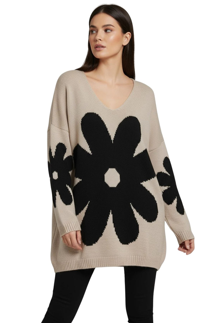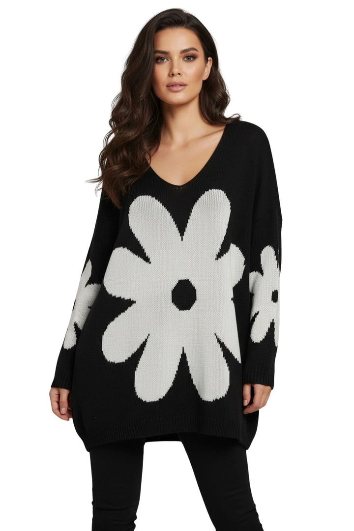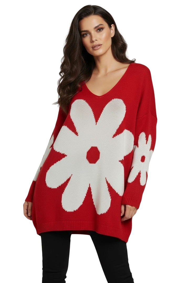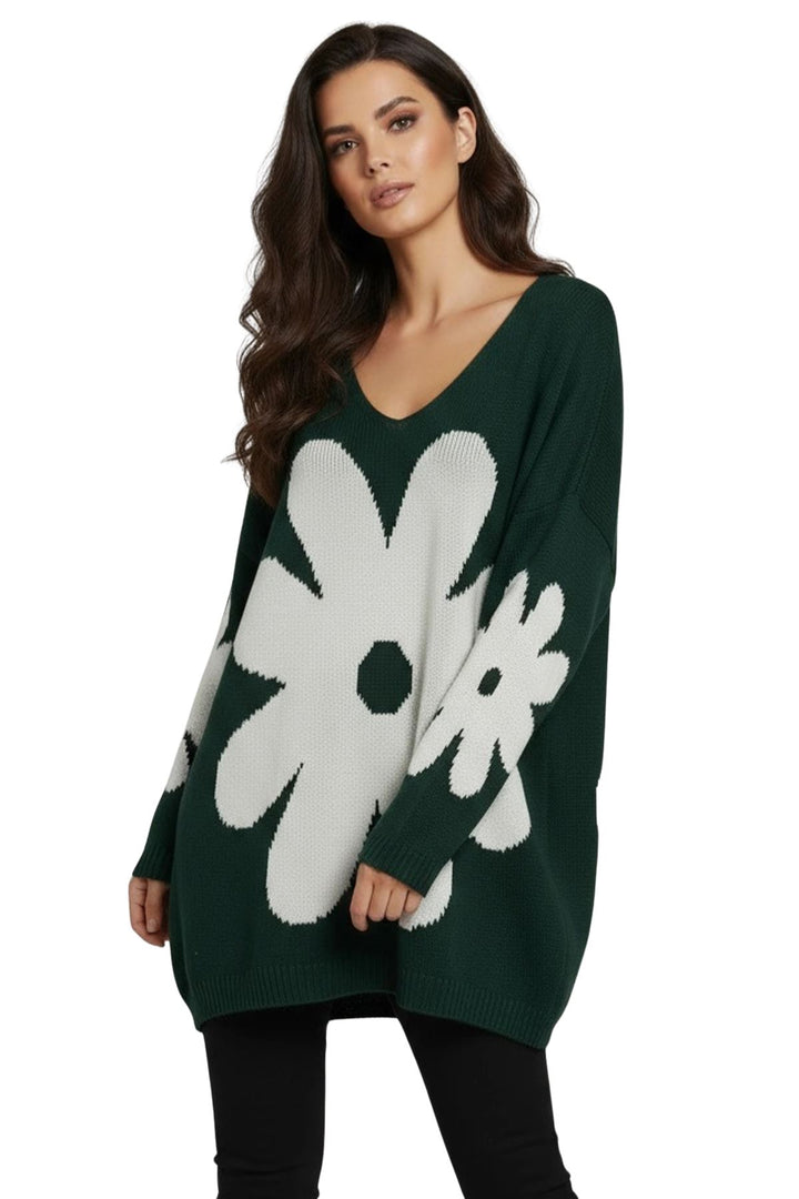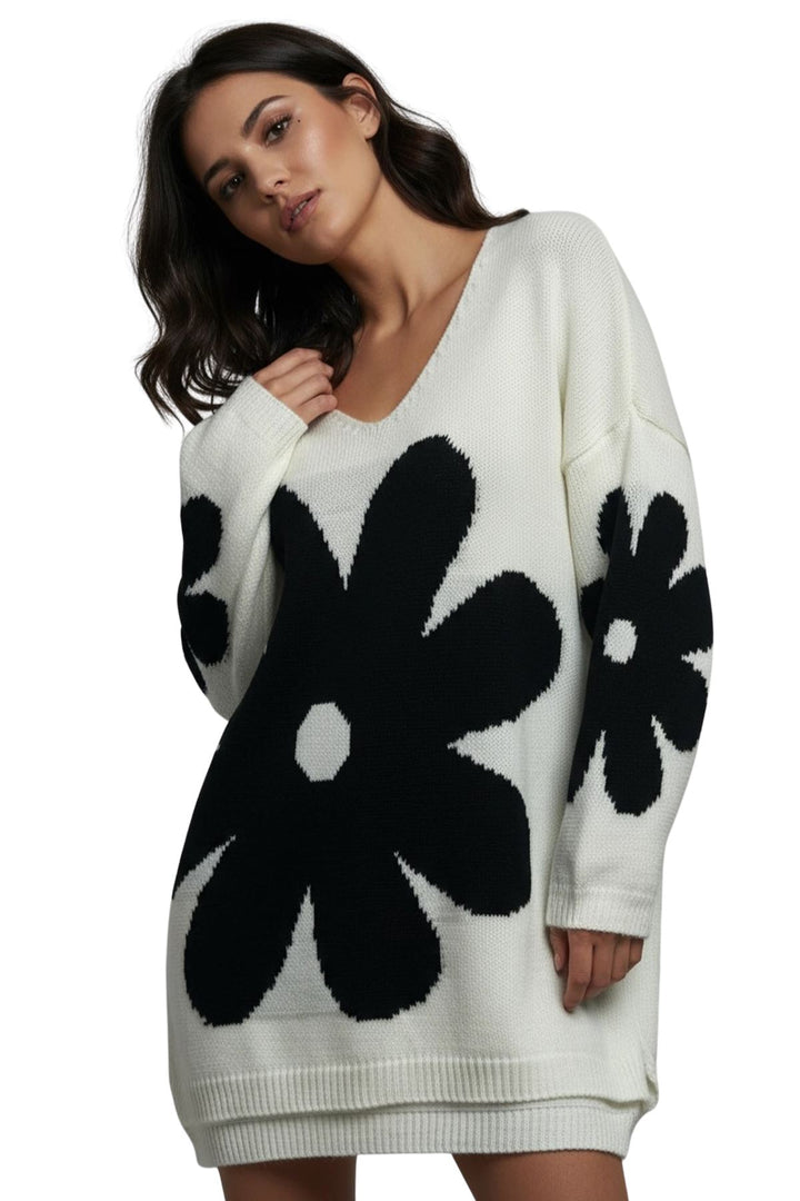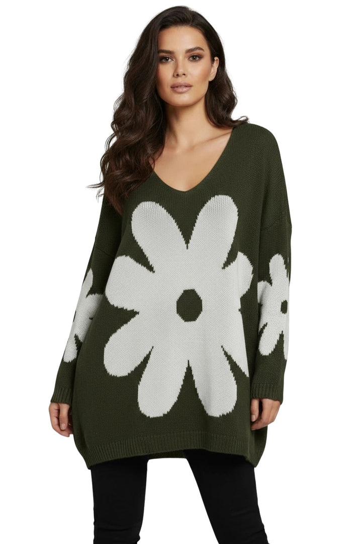 Elevate your cold-weather wardrobe with this Italian-inspired oversized knit sweater, designed to combine comfort and style. Featuring a charming daisy flower pattern, this piece brings a playful yet sophisticated touch to your autumn and winter outfits. Crafted from a soft acrylic knit blend, it offers warmth with a cozy, breathable texture. The relaxed silhouette with a flattering V-neckline and drop-shoulder long sleeves ensures effortless layering over tees, shirts, or even dresses. A distinctive high-low hemline with ribbed cuffs and edges creates a trendy shape, slightly longer at the back for added coverage and ease of movement. Whether paired with jeans for a casual day out or leggings for a laid-back look, this sweater is versatile and stylish. Perfect for cozy days indoors or outdoor strolls, the floral design gives it a standout charm, making it a must-have essential for everyday casual wear in fall and winter.
