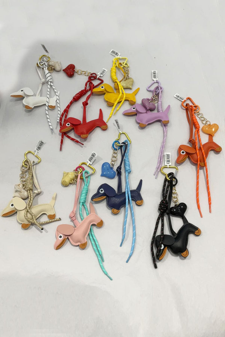 Bring a dash of cuteness to your accessories with these adorable dachshund dog charm keychains. Crafted from smooth faux leather and available in a variety of vibrant colors, each charm features a playful dog shape paired with a coordinating heart pendant and colorful cords. With their fun expressions and whimsical detailing, these charms are perfect for decorating bags, phone cases, zippers, or key rings. The added gold-tone hardware and soft-touch finish offer both charm and durability. Whether you're gifting it or accessorizing for yourself, this delightful dog keychain adds personality, fun, and a fashionable flair to your everyday essentials.
