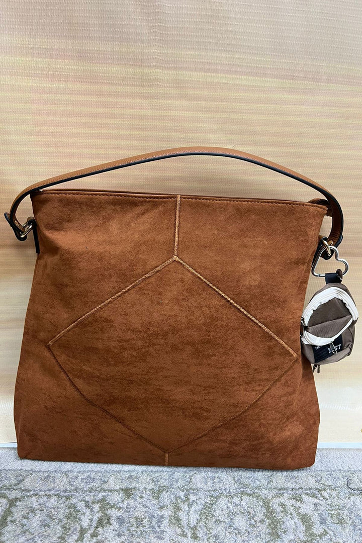 Add a touch of modern elegance to your everyday look with this Women’s Burgundy Suede Shoulder Bag. Crafted from ultra-soft faux suede, this spacious tote features a chic geometric panel design on the front for a contemporary twist. The deep burgundy shade exudes sophistication, making it perfect for both casual and semi-formal outings. Designed with a sturdy single shoulder strap and a roomy interior, it easily accommodates all your daily essentials like phone, wallet, makeup, and more. A detachable keychain charm adds a playful accent, while the zip-top closure keeps your belongings secure. Ideal for work, shopping, travel, or weekend getaways, this bag combines functionality with refined fashion appeal.