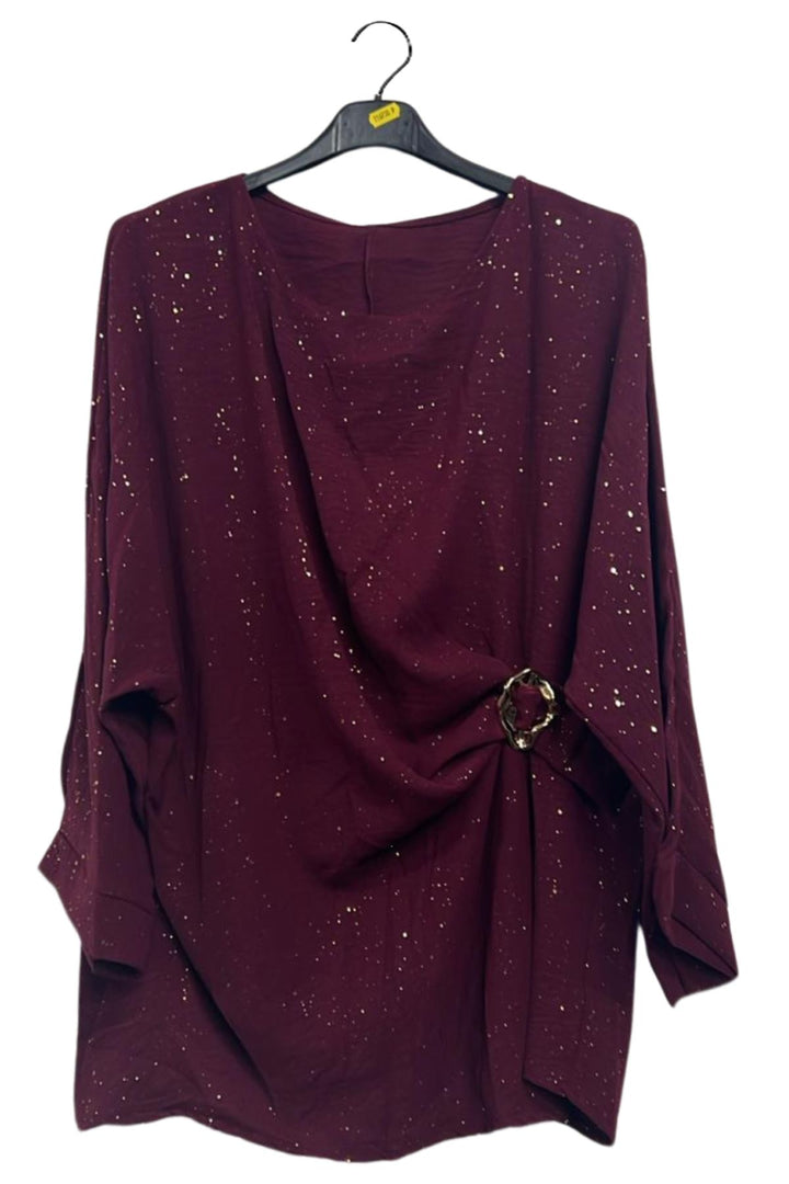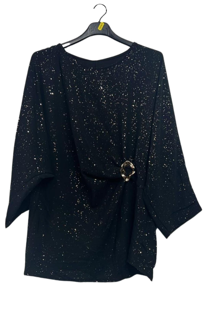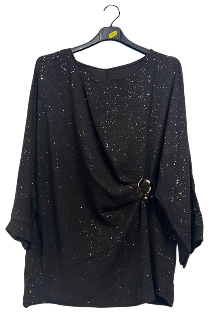 Shine with understated elegance in this Italian-made women’s drape top, crafted from soft and flowy polyester for all-day comfort. Designed in a relaxed, loose fit, it features a flattering round neckline and chic 3/4 sleeves, making it perfect for layering in autumn or mild winter. The solid-colour base is adorned with subtle glitter specks that catch the light beautifully, creating a delicate shimmer effect. A distinctive draped front with a decorative side ring detail adds a touch of sophistication and shape to the silhouette. Whether paired with jeans for casual outings or trousers for semi-formal gatherings, this versatile top delivers effortless glamour. Ideal for festivals, travel, and everyday wear, it combines Italian craftsmanship with timeless feminine charm.