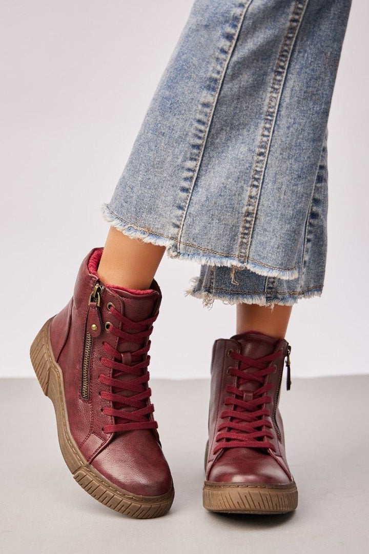 Step out in style with these women’s burgundy high-top sneakers — the perfect fusion of casual comfort and street-smart fashion. Crafted from soft faux leather, these sneakers feature a sleek lace-up front with a functional side zipper for easy on and off. The cushioned interior lining ensures comfort throughout the day, while the durable rubber sole provides reliable grip and support. Designed in a rich burgundy shade with subtle stitching details, these sneakers effortlessly complement jeans, joggers, or casual dresses. Ideal for autumn and winter wear, they offer both warmth and versatility. Whether for weekend outings, travel, or everyday errands, these high-top trainers deliver a chic, sporty edge to your look.