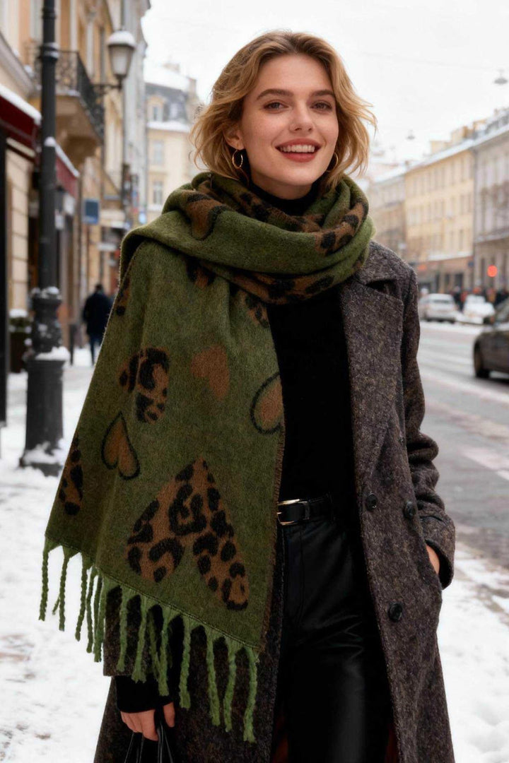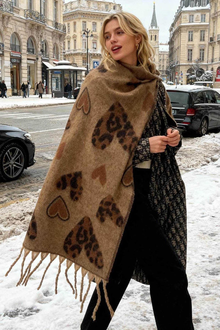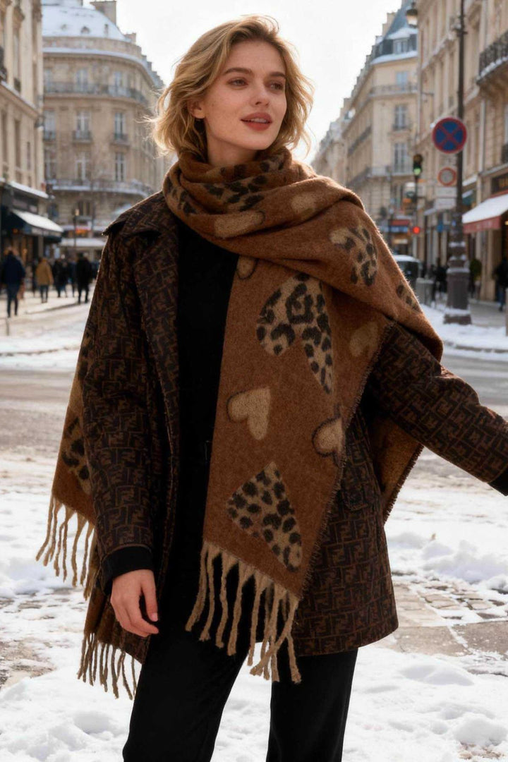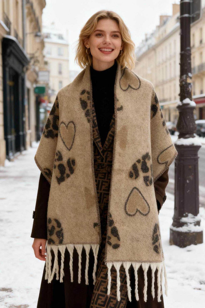 Wrap yourself in cozy luxury with this Women’s Beige Leopard Heart Print Winter Shawl — a perfect mix of warmth, comfort, and timeless fashion. Made from ultra-soft, high-quality fabric, this chic shawl features a beige base with a charming leopard and heart pattern, giving it a stylish and feminine appeal. The tassel-fringed edges add a boho-chic touch, while the generous size allows for versatile styling — wear it as a shawl, wrap, or oversized scarf. Ideal for cold winter days, it keeps you snug while elevating your look effortlessly. Whether paired with casual outerwear or elegant coats, this shawl is your go-to accessory for the season.