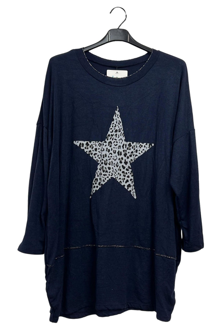 This Italian viscose top blends contemporary charm with cozy comfort, making it a must-have for your autumn-winter wardrobe. Crafted from a lightweight knit fabric, it offers a relaxed, oversized silhouette with a slightly longer length for effortless layering. The round neckline and long sleeves create a timeless look, while the straight hem is accentuated by a visible horizontal seam for added texture. Decorative stitching near the lower part of the top enhances its artisanal feel. The centerpiece is a striking large star graphic in the middle, filled with a bold leopard print that adds a playful edge to the design. Perfect for casual days, this plus-size top pairs beautifully with jeans or leggings, ensuring comfort without compromising style. Whether you’re lounging at home or heading out for coffee, this piece offers everyday wearability with a fashionable twist.