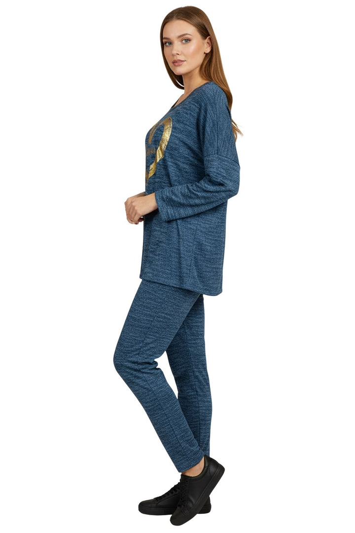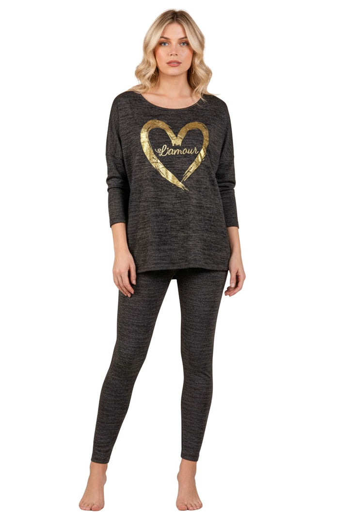 Elevate your everyday autumn-winter wardrobe with this charming Italian viscose co-ord set, thoughtfully crafted for comfort and effortless style. Adorned with a bold metallic foil heart, the top adds a playful sparkle that catches the light just right. Featuring a round neckline and 3/4 sleeves, it brings casual elegance to any occasion. The elasticated waistband on both the top and the open-hem trousers ensures a relaxed, secure fit for all-day wear. Tailored in a plus-size, loose-fit silhouette, this two-piece ensemble flatters the figure while offering breathable softness and warmth for cooler days. The open-hem trousers flow comfortably, making movement easy, whether you're lounging at home or heading out for errands. With a blend of Italian craftsmanship and cozy viscose fabric, this set is your go-to for laid-back chic. Pair with sneakers or ankle boots for a complete, fuss-free look that balances fashion and function perfectly.