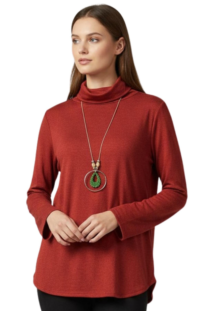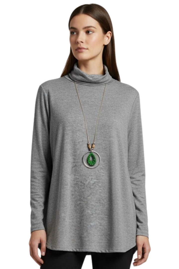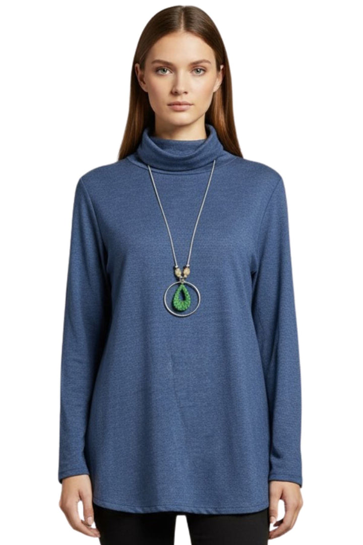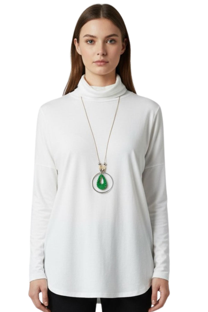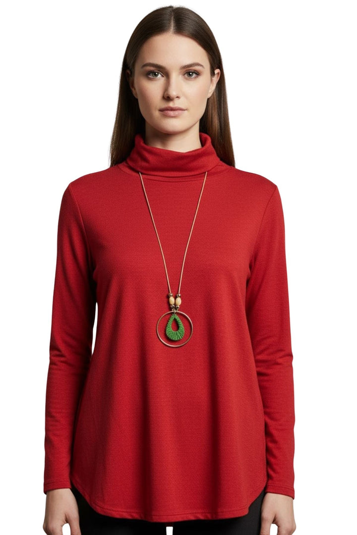 Stay effortlessly chic this season in this Italian Viscose Plain Curved Hem Tunic Top, a perfect blend of elegance and comfort. Crafted from a lightweight soft knit or jersey blend fabric, it features a turtleneck (fold-over collar) that adds a touch of sophistication while keeping you cozy during cooler months. The round curved hemline flatters every figure, while the loose, relaxed fit ensures freedom of movement. Designed with long sleeves and moderate stretch, it offers breathable comfort for layering through fall, winter, or early spring. The look is beautifully finished with a silver-framed green teardrop pendant necklace, adding subtle glamour. Ideal for office casual wear, travel, or everyday outings, this tunic pairs effortlessly with leggings, jeans, or tailored trousers. A timeless Italian-made essential, it combines simplicity and modern style, making it a versatile piece for every woman’s wardrobe.