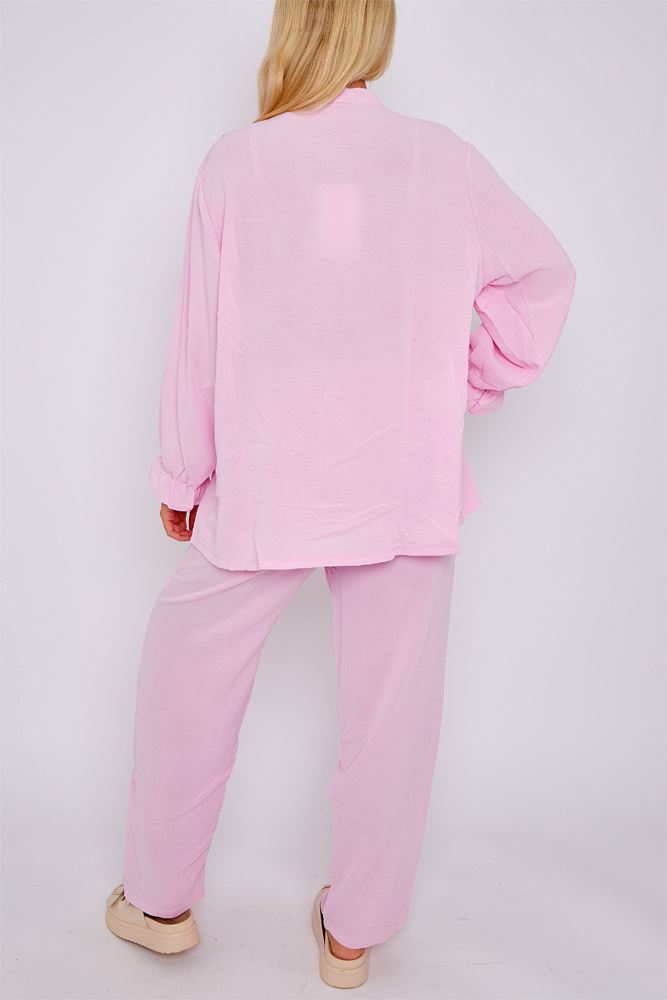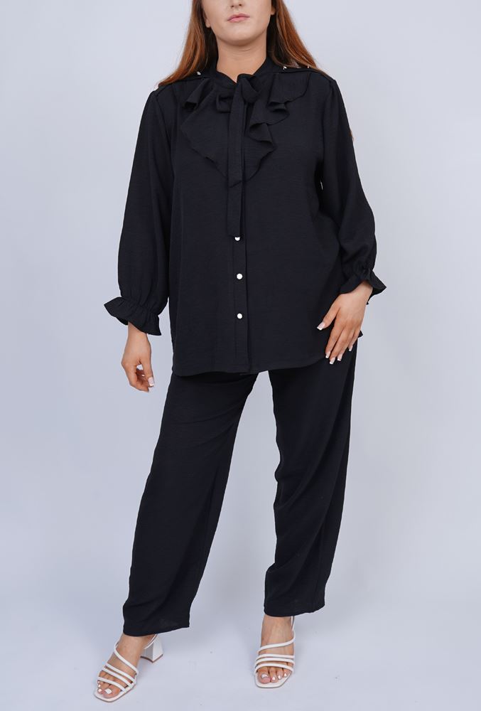 Need 3 different 150 words clothing description based on these bullet points Polyester,Plain,Collar,Long Sleeve,Plus Size,Loose Fit,Casual,Spring Summer,Front Ruffle Button Up,Elasticated Wasit,Co-Ord for Women
