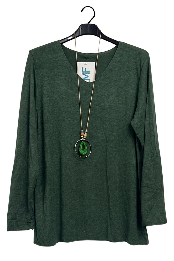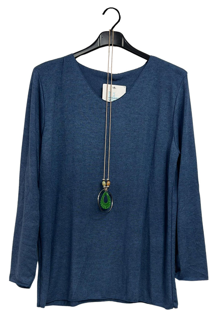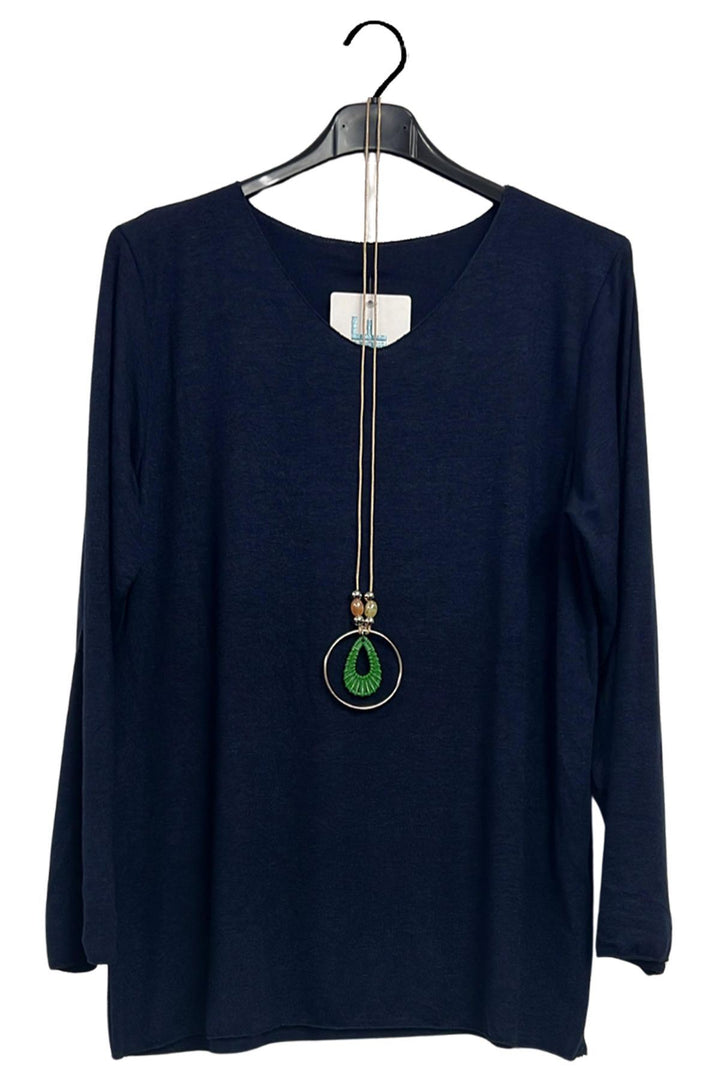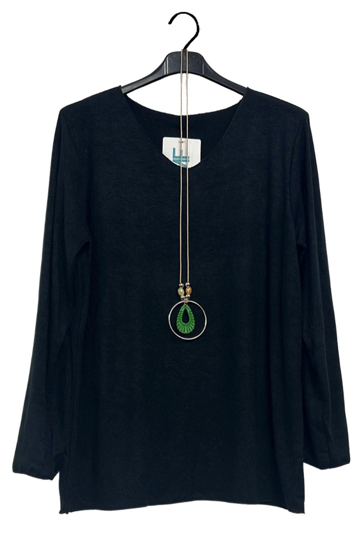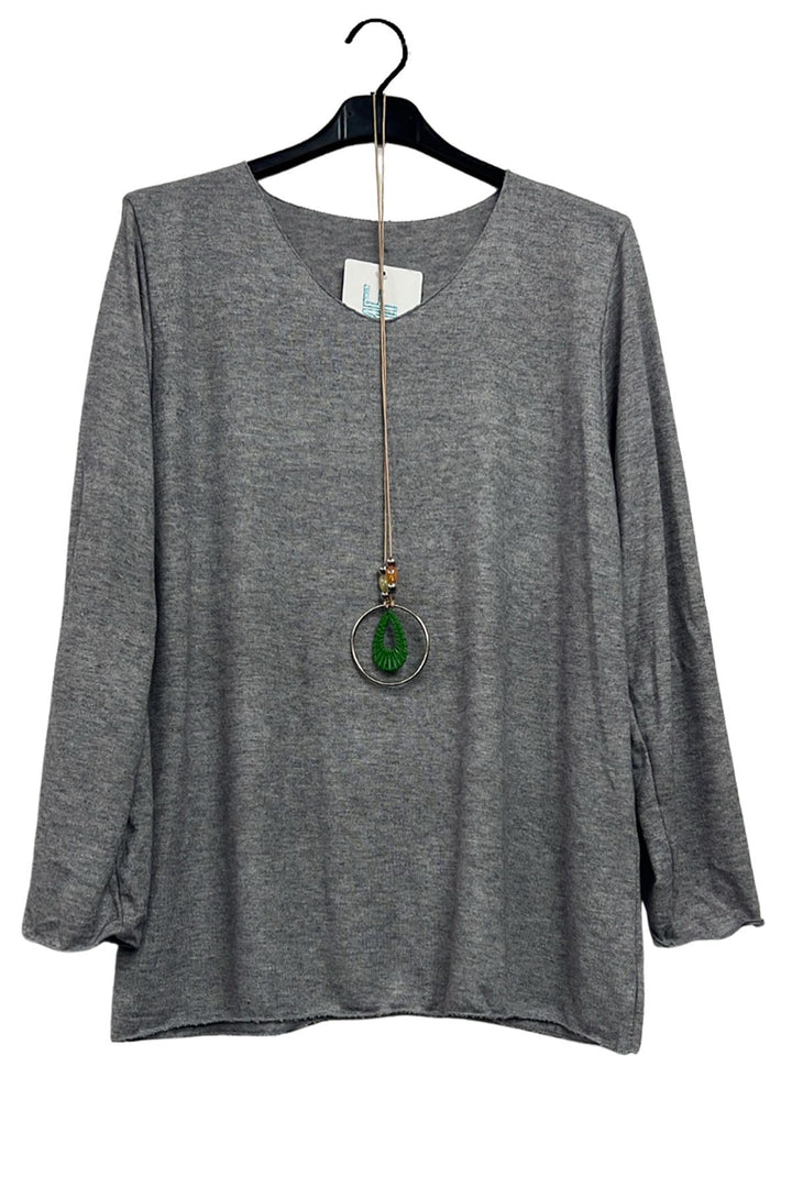 Step into effortless style with this Italian Viscose soft knit tunic, a perfect blend of comfort and elegance for the autumn-winter season. Crafted from luxuriously smooth knit fabric, it offers a regular yet relaxed fit that drapes beautifully over plus-size figures. The classic round neckline frames the face, while long sleeves provide cozy coverage for cooler days. A straight hemline keeps the silhouette clean and versatile, making it easy to pair with leggings, jeans, or tailored trousers. Designed as both a wardrobe staple and a statement piece, it comes accessorized with a striking long necklace featuring a green teardrop-shaped pendant encased in a circular silver-toned frame, suspended from a delicate chain. This thoughtful detail adds a subtle pop of colour and sophistication, eliminating the need for extra accessorizing. Ideal for casual outings, coffee dates, or layering under outerwear, this tunic is your go-to for everyday chic comfort.