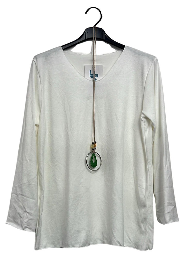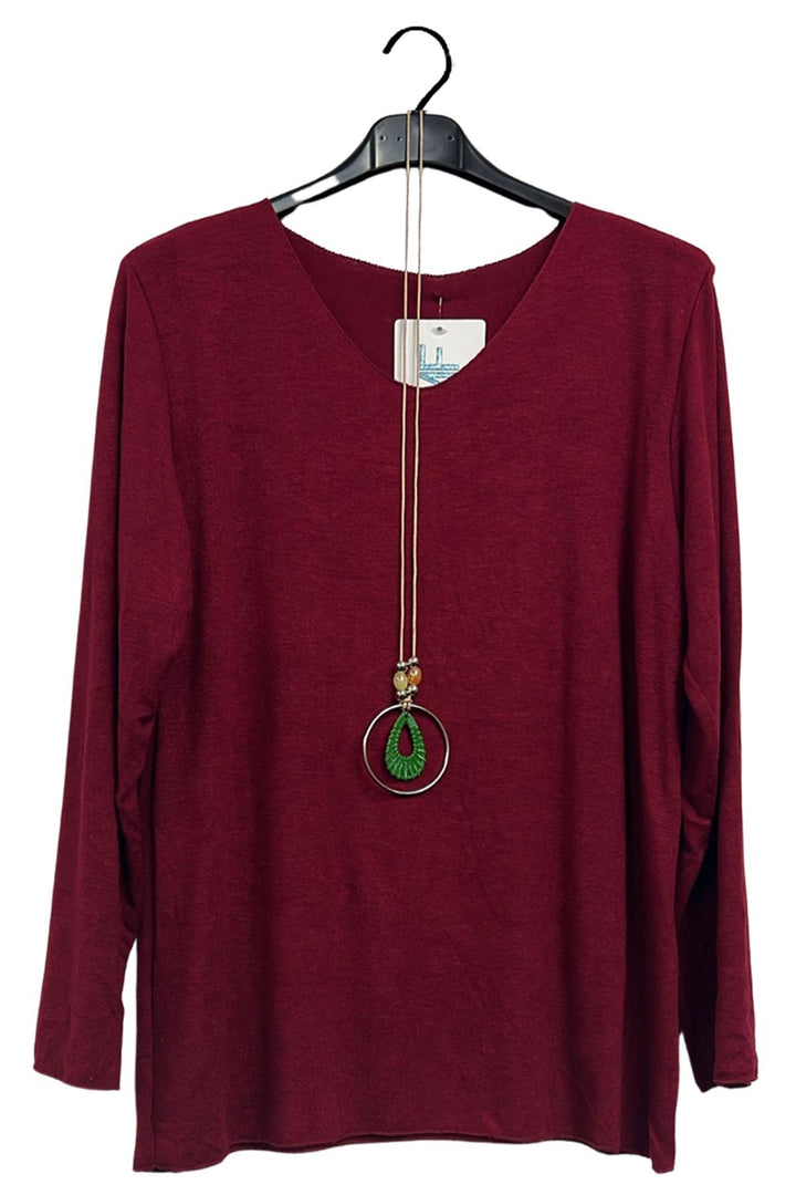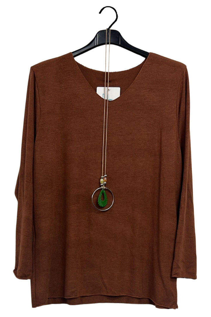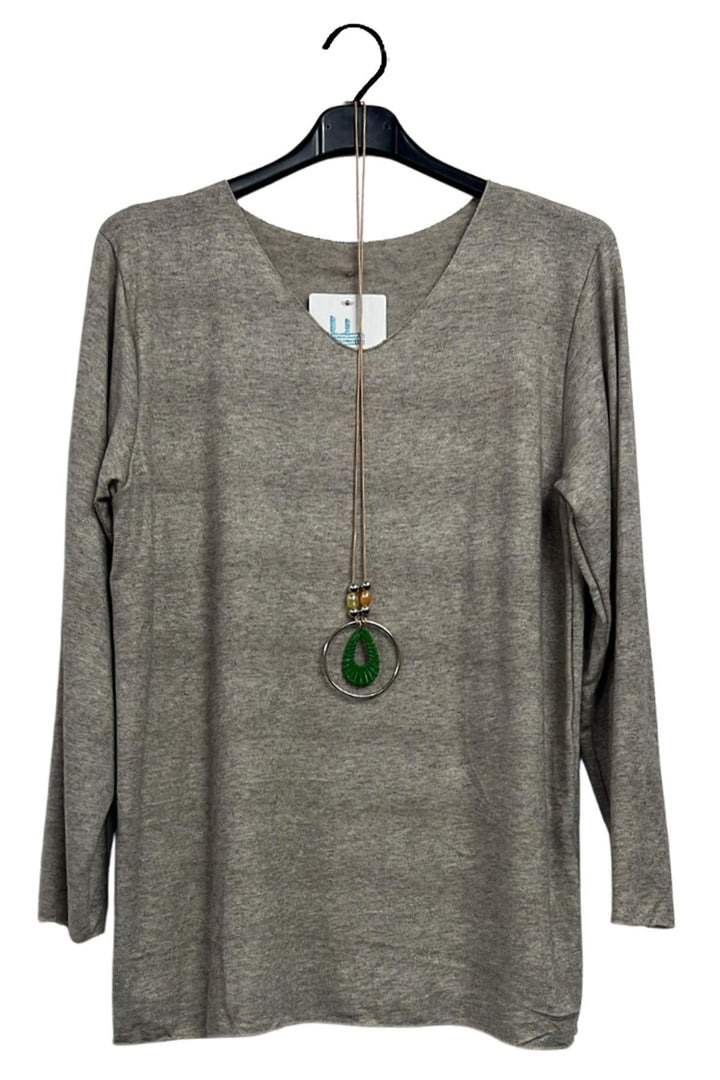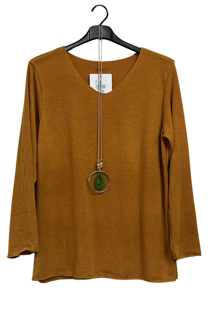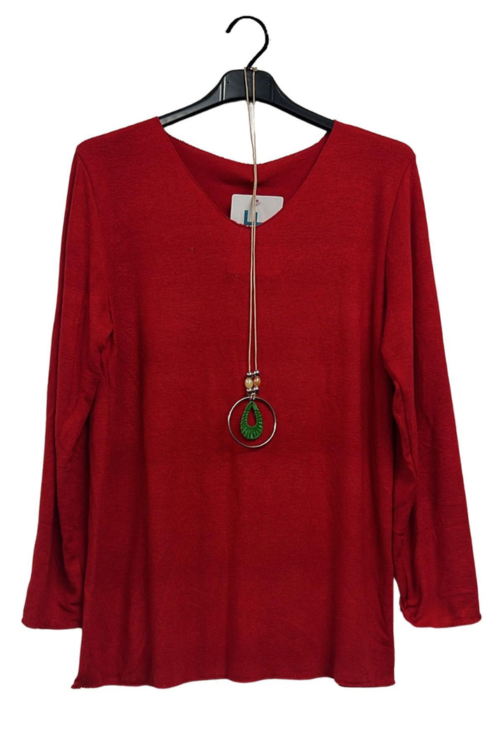 Step into effortless style with this Italian Viscose soft knit tunic, a perfect blend of comfort and elegance for the autumn-winter season. Crafted from luxuriously smooth knit fabric, it offers a regular yet relaxed fit that drapes beautifully over plus-size figures. The classic round neckline frames the face, while long sleeves provide cozy coverage for cooler days. A straight hemline keeps the silhouette clean and versatile, making it easy to pair with leggings, jeans, or tailored trousers. Designed as both a wardrobe staple and a statement piece, it comes accessorized with a striking long necklace featuring a green teardrop-shaped pendant encased in a circular silver-toned frame, suspended from a delicate chain. This thoughtful detail adds a subtle pop of colour and sophistication, eliminating the need for extra accessorizing. Ideal for casual outings, coffee dates, or layering under outerwear, this tunic is your go-to for everyday chic comfort.