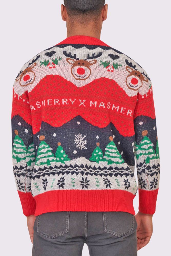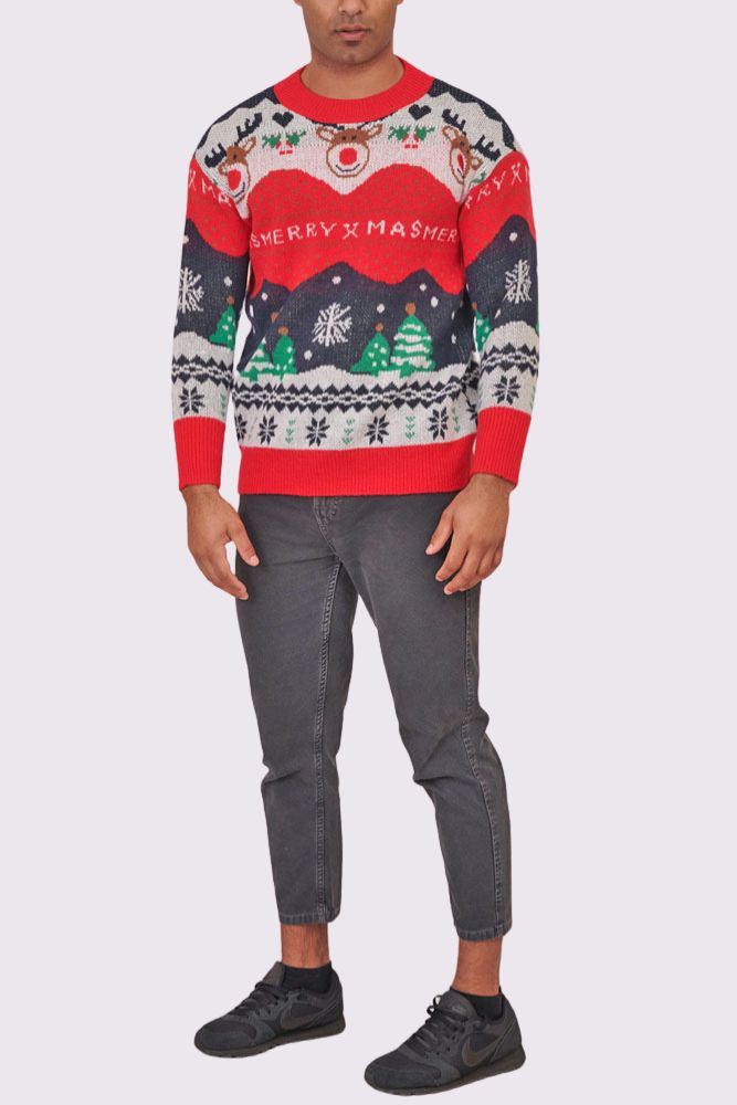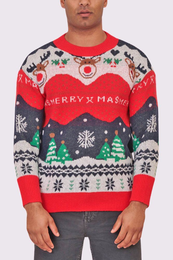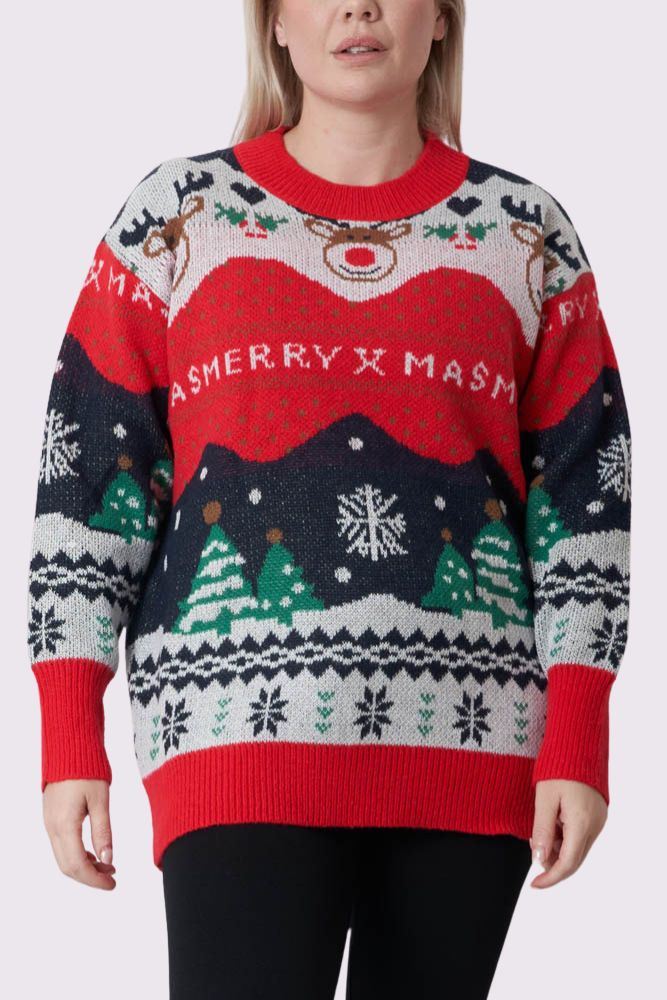 Reindeer Face Pattern Xmas Ribbed Jumper