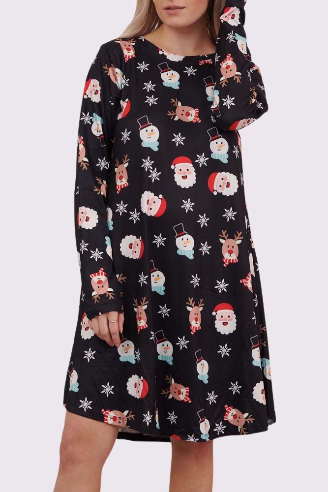 Celebrate the holidays in cozy style with this printed Christmas swing dress. Crafted from a soft knitted fabric, this dress is perfect for cooler weather, keeping you warm while embracing the festive spirit. The classic crew neck and long sleeves provide a snug, comfortable fit, while the swing silhouette allows for an easy, relaxed flow that flatters all body shapes. The playful Christmas print adds a cheerful touch, making it the ideal outfit for holiday gatherings, family photos, or cozy nights in. Pair it with tights and ankle boots for a festive, yet comfortable, winter look that shines with holiday charm.