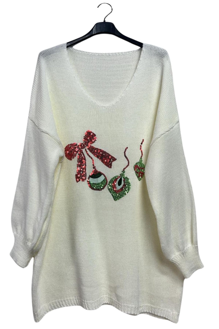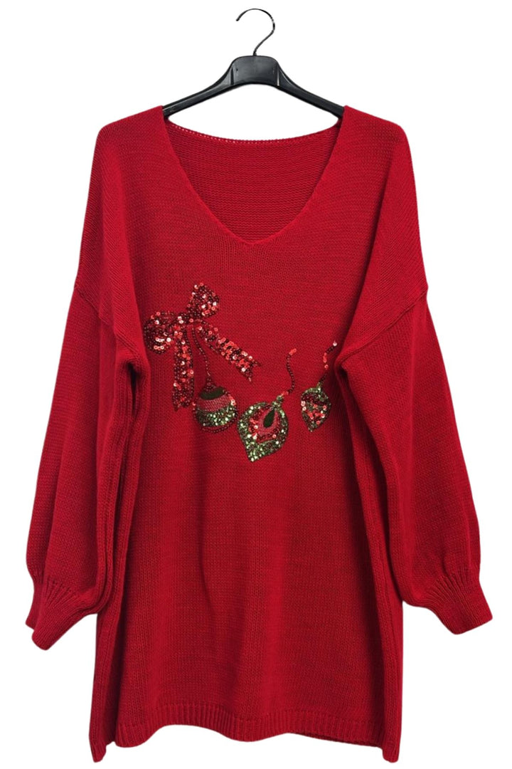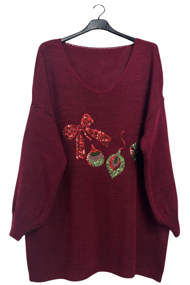 Bring holiday cheer to your wardrobe with this stylish Acrylic V-Neck Plus Size Holiday Jumper, designed for women who love comfort with a festive twist. The front features a beautiful red sequin bow with flowing ribbon tails, highlighted by green sequin holiday ornaments, creating a stunning centerpiece that adds sparkle to any outfit. Crafted from a lightweight, soft, and cozy knitted fabric, this sweater ensures warmth without feeling heavy. The drop-shoulder long sleeves, relaxed oversized fit, and straight hemline offer effortless comfort, making it ideal for layering during the fall and winter seasons. The ribbed knitted texture enhances its classic appeal while keeping the look polished and modern. Whether you're heading to a holiday gathering, enjoying a casual outing, or traveling during the festive season, this jumper delivers the perfect mix of style, warmth, and cheerful charm.