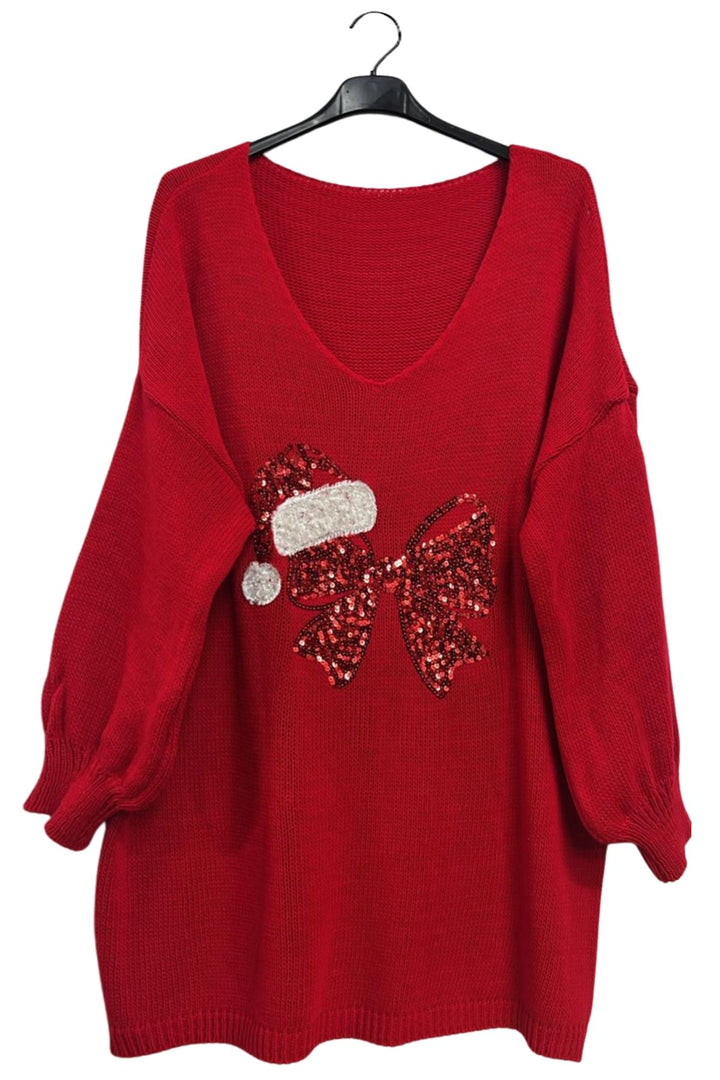 Embrace the festive season with this stunning Italian Acrylic V-Neck Holiday Jumper, designed in a plus-size oversized fit for ultimate comfort. Featuring a beautifully detailed red sequin bow paired with a red-and-white sequin Santa hat, this sweater brings cheerful holiday charm to any outfit. The drop-shoulder silhouette, slightly ballooned long sleeves, and relaxed fit create an effortlessly cozy look, perfect for layering during chilly fall and winter days. Made from a lightweight yet warm knitted fabric, it feels soft and comfortable against the skin. The ribbed knitted texture and straight hemline give it a polished finish while maintaining casual versatility. Ideal for holiday parties, everyday winter wear, evening outings, and festive travel, this oversized sweater adds sparkle, warmth, and personality to your seasonal wardrobe. Pair with jeans or leggings for an effortlessly stylish festive look.