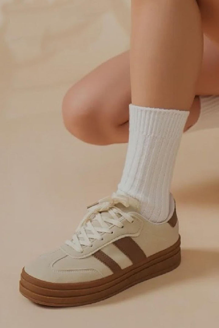 Step into comfort and classic style with these women’s beige retro lace-up sneakers. Featuring a soft canvas upper accented with contrasting brown side stripes, these trainers bring a timeless sporty look to your casual wardrobe. The thick rubber sole offers superior grip and support, making them perfect for everyday wear, travel, or light outdoor activities. Designed with breathable lining and cushioned insoles, they provide all-day comfort while maintaining a sleek silhouette. Whether paired with jeans, joggers, or skirts, these beige and brown sneakers blend effortlessly into any outfit — a perfect mix of vintage flair and modern functionality. Ideal for casual outings, weekend errands, or a relaxed day on the go.