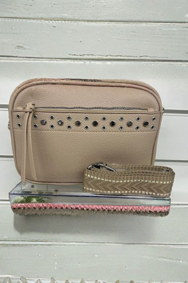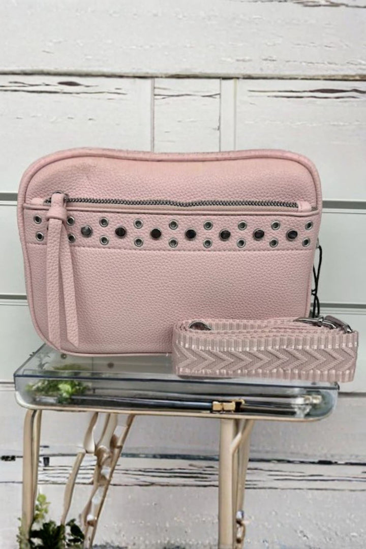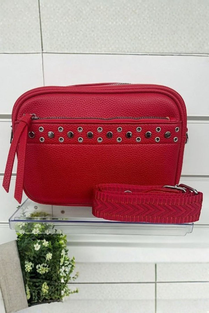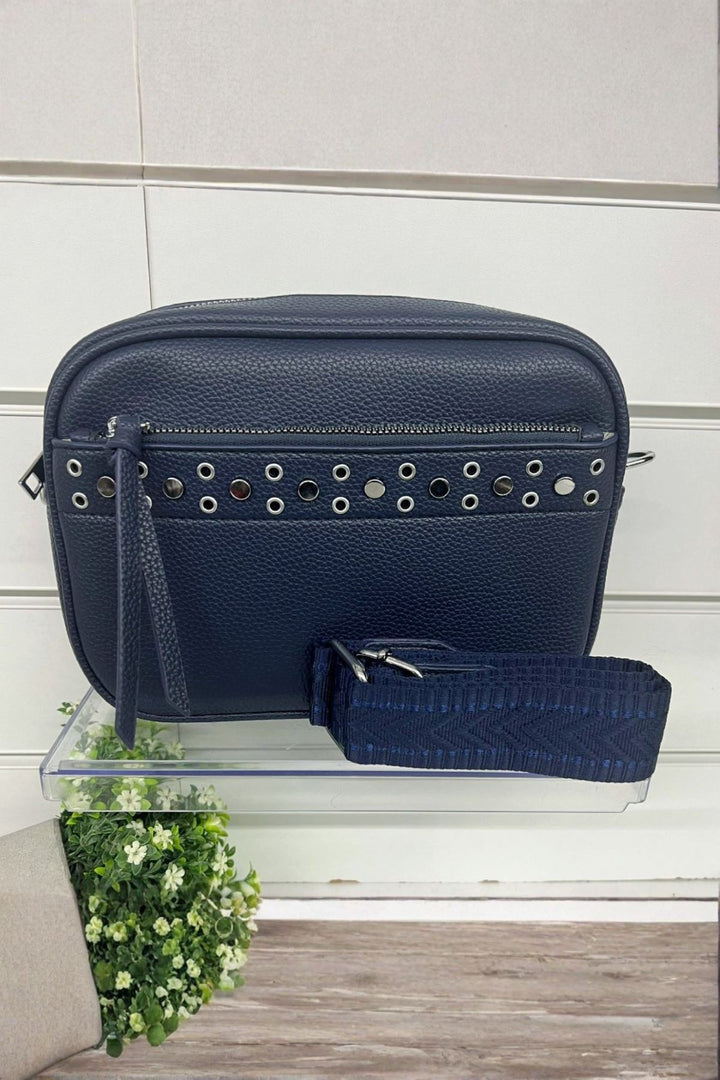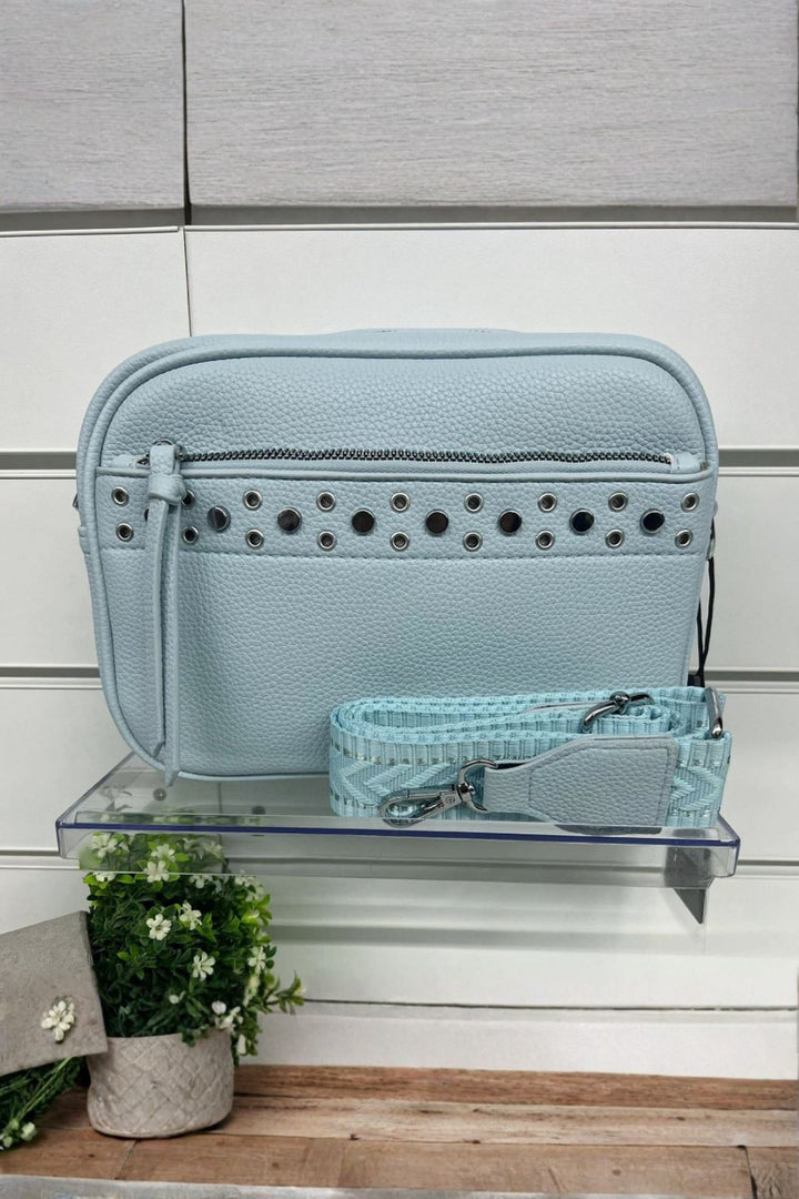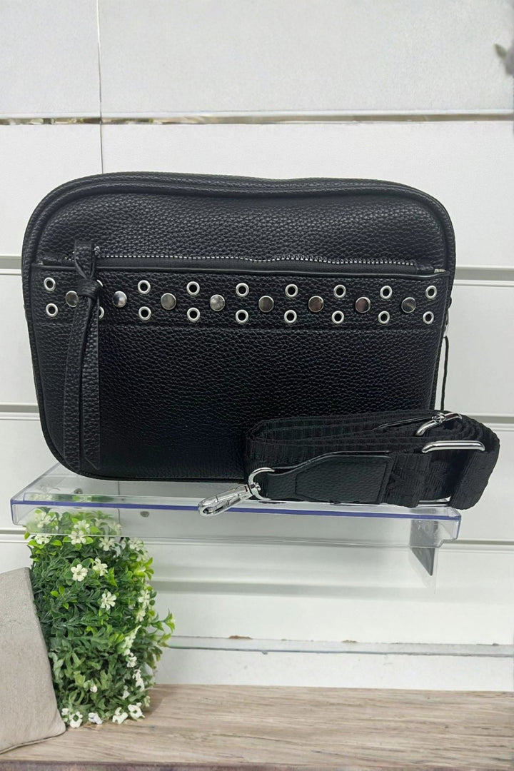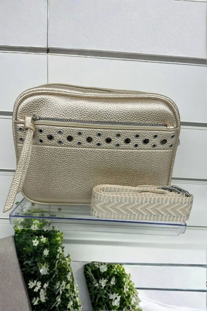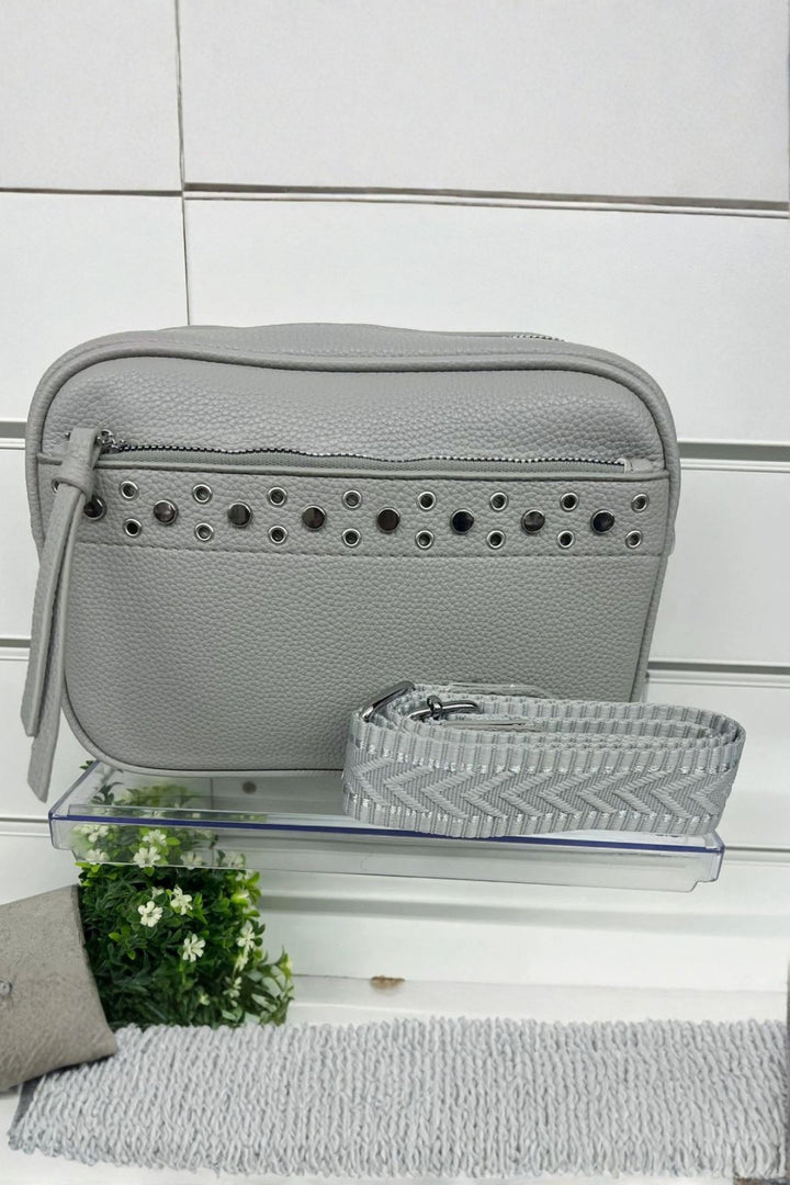 Add a touch of sophistication to your daily ensemble with this chic grey faux leather crossbody bag. Crafted from high-quality, textured faux leather, this bag boasts a modern rectangular silhouette and practical compact size, perfect for on-the-go fashionistas. The front features a bold grommet stud embellishment for a stylish edge, while the top zipper keeps your essentials secure. The matching adjustable strap with a herringbone pattern offers both comfort and versatility—wear it crossbody or over the shoulder. Ideal for casual outings, shopping days, or travel, this bag combines style with everyday function, effortlessly complementing your wardrobe with its neutral tone and refined design.