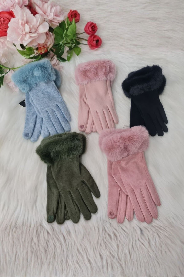 Stay warm and stylish this winter with these Women’s Faux Fur Cuff Gloves, crafted from soft suede-like fabric and lined for extra comfort. Featuring a plush faux fur cuff for a luxurious touch, these gloves combine elegance with functionality. Available in a range of chic colours including blush pink, navy, olive green, and powder blue, they pair perfectly with any winter outfit. The soft inner lining keeps your hands cozy, while the refined design makes them suitable for both everyday wear and special occasions. Perfect for gifting, these gloves offer the ideal blend of warmth, comfort, and fashion.