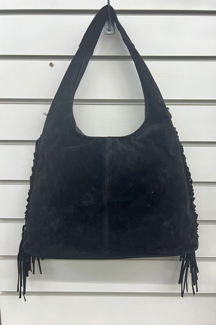 Add effortless bohemian flair to your everyday look with this women’s black suede shoulder bag. Crafted from soft faux suede, this large hobo-style handbag features a relaxed silhouette with playful fringe detailing along the sides, giving it a chic yet laid-back vibe. The spacious interior provides ample room for your daily essentials — from your phone and wallet to makeup and accessories — making it perfect for work, travel, or casual outings. Its single wide shoulder strap ensures comfortable wear, while the soft-touch texture adds a luxurious finish. Designed to complement both casual and smart outfits, this fringe shoulder bag combines practicality with timeless boho-inspired style, making it a versatile must-have for every modern wardrobe.