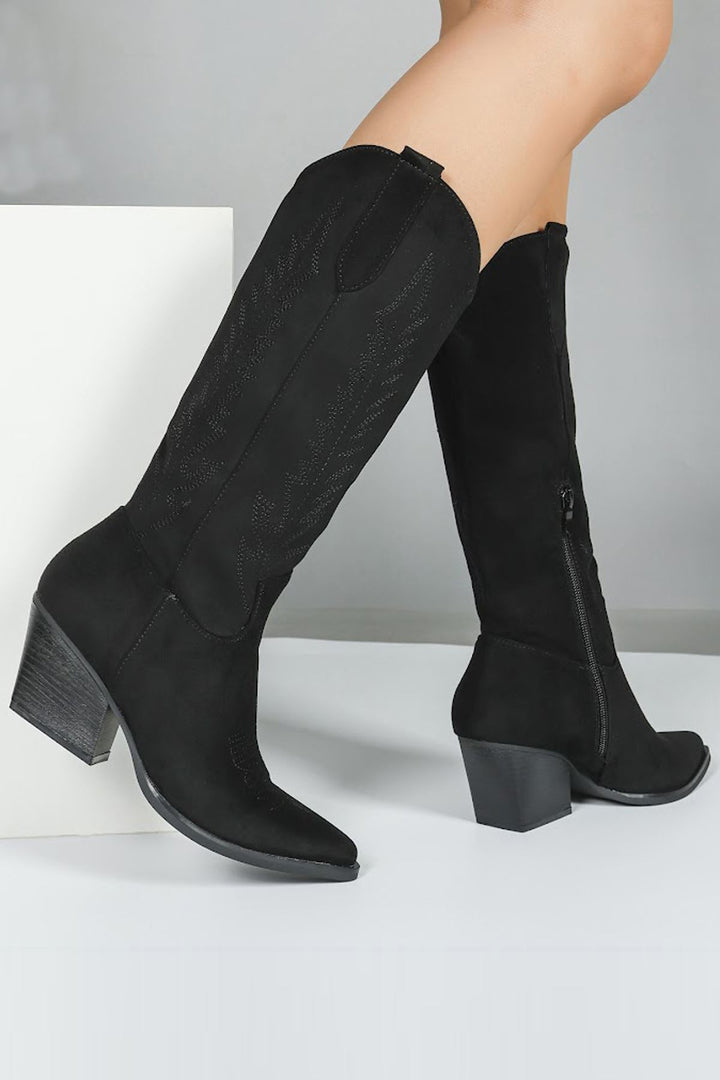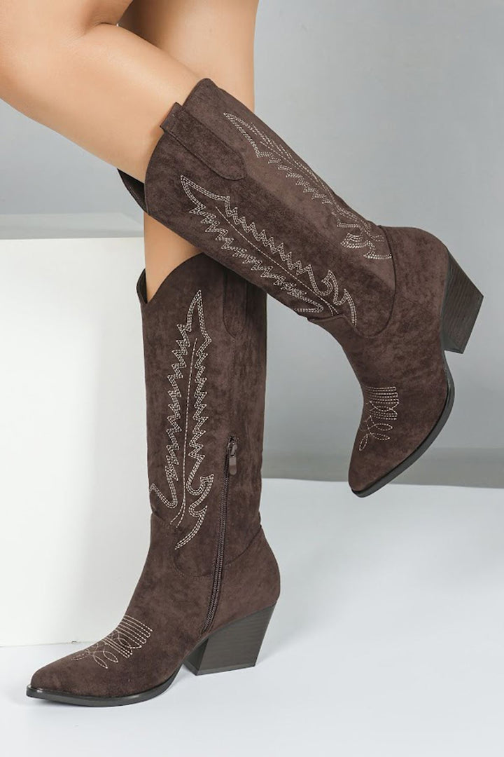 Embrace timeless Western flair with the GIVANA Women’s Cowboy Boots — a bold blend of sophistication, comfort, and country-inspired style. Crafted from premium faux suede in a rich dark brown shade, these knee-high boots feature intricate embroidered detailing that adds a touch of artistry and femininity. The classic pointed toe and stacked block heel enhance your silhouette while providing stability and confidence with every step. Designed with a side zipper for easy wear and a soft inner lining for lasting comfort, these boots are perfect for festivals, casual outings, or chic everyday looks. Pair them effortlessly with jeans, skirts, or flowy dresses for an elevated Western-inspired outfit. Ideal for autumn through spring, they combine trend, durability, and all-day ease — a must-have for every modern wardrobe.