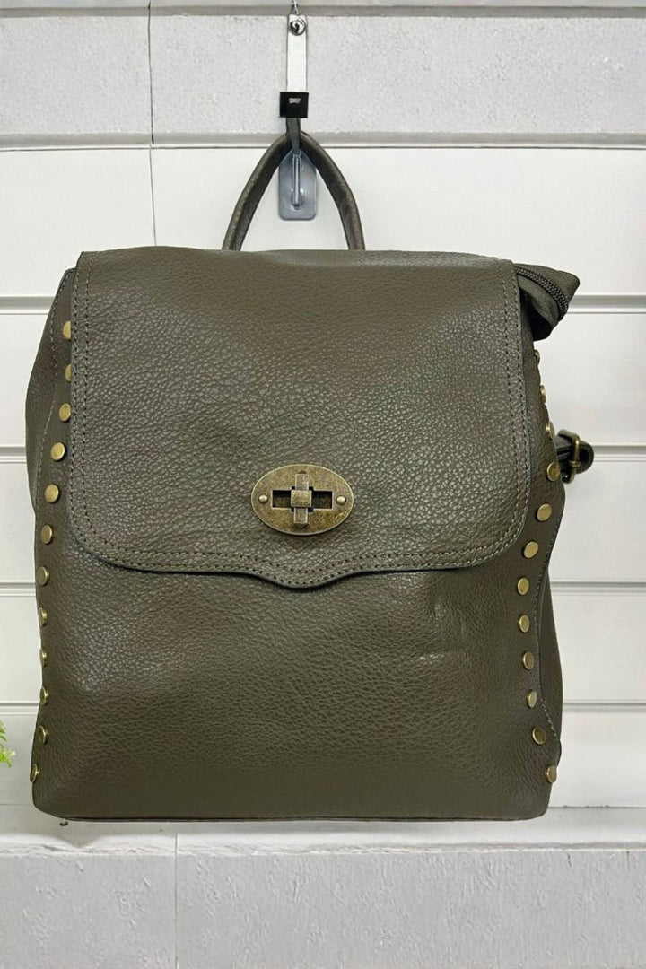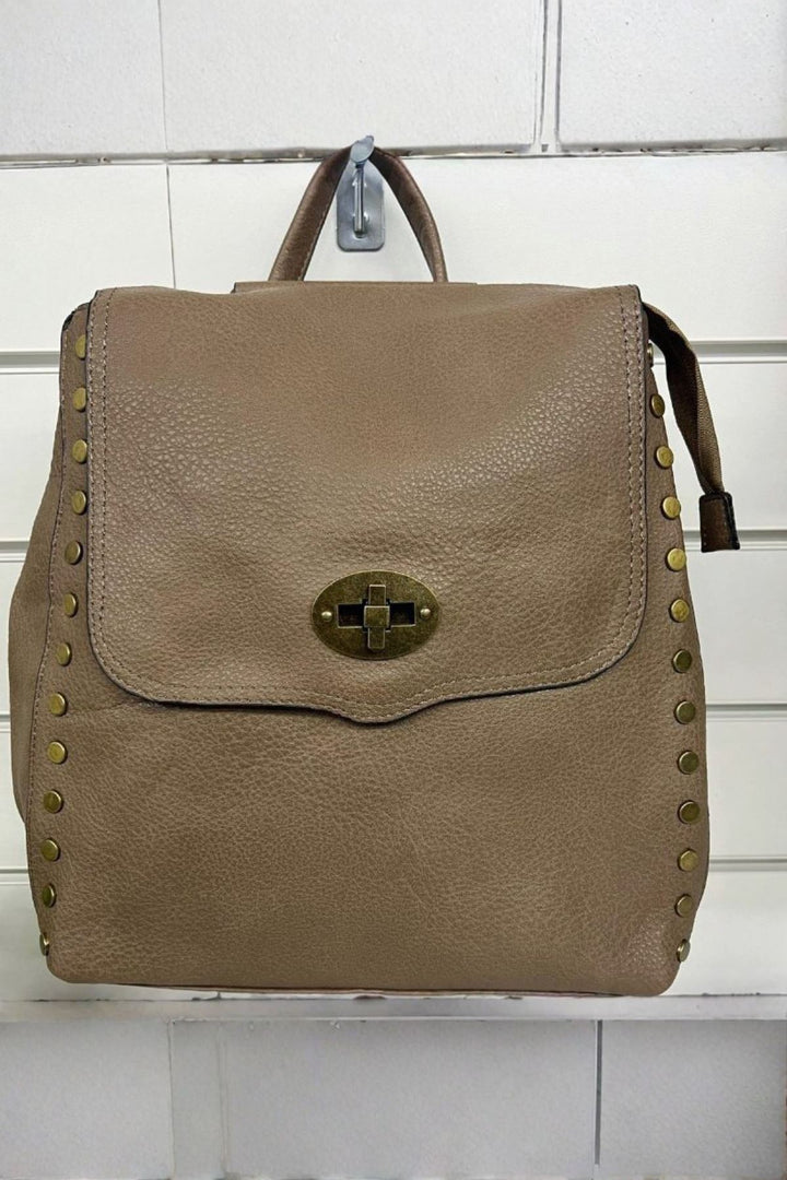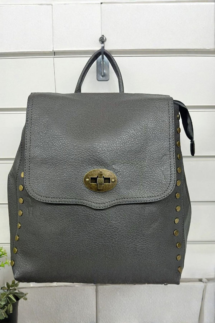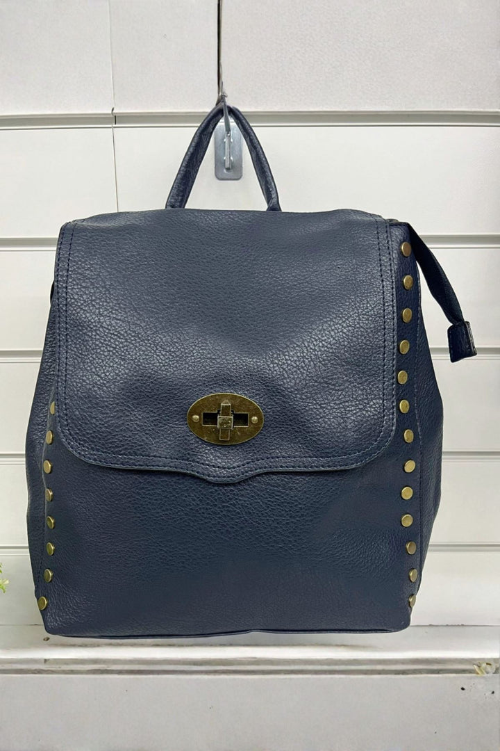 Elevate your everyday look with this chic and functional Studded Edge Faux Leather Backpack in a classy muted blue shade. Made from durable, textured faux leather, it combines timeless elegance with modern utility. The front flap features an antique-style twist-lock closure for added security and vintage charm. Studded metal rivets along the sides add a bold statement, making this backpack both stylish and practical. It includes a sturdy top handle and adjustable shoulder straps for versatile wear. Whether you're heading to work, university, or a weekend trip, this backpack offers ample space and durability for all your essentials.