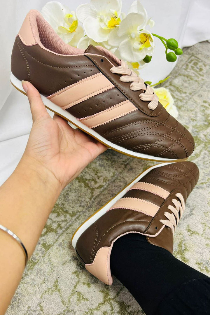 Step out in sporty sophistication with these women’s brown and pink lace-up sneakers, designed for style, comfort, and versatility. Crafted from smooth faux leather, these trainers feature a classic low-top silhouette enhanced by soft pink stripe accents for a chic, feminine touch. The cushioned insole and padded collar ensure comfort throughout the day, while the durable rubber outsole provides excellent traction for everyday wear. Perfect for pairing with jeans, joggers, or casual dresses, these sneakers add a pop of elegance to any outfit. Whether you’re heading to the gym, running errands, or meeting friends, these retro-inspired trainers bring timeless appeal and effortless comfort to your step.
