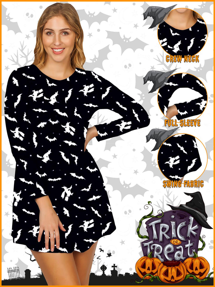 Get your ideal flared swing dress for this Halloween. Featuring long sleeve crew neck multiple halloween prints for casual wear in halloween evening party. It is made of very soft comfortable material.