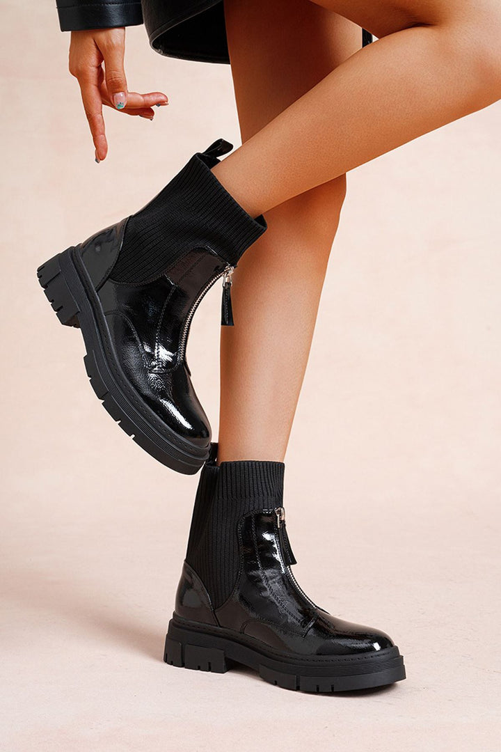 Make a bold statement this season with these eye-catching women's patent red ankle boots, crafted for the modern trendsetter. Designed with a glossy finish, these boots boast a standout red faux leather exterior paired with a ribbed black sock-like upper that hugs the leg comfortably while adding a sporty edge. The functional front zip adds both flair and ease of wear, while the chunky cleated sole delivers grip, stability, and all-day comfort. Whether you're pairing them with jeans, leggings, or a skirt, these boots effortlessly elevate any casual or streetwear outfit. Ideal for autumn and winter wardrobes, these boots blend fashion-forward design with practical comfort. Step into urban cool with confidence and style.